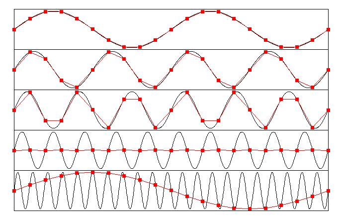 4段目の波形では ナイキスト周波数 < サイン波の周波数 となり、サンプリング波形の周波数は元のサイン波の周波数と異なっています。